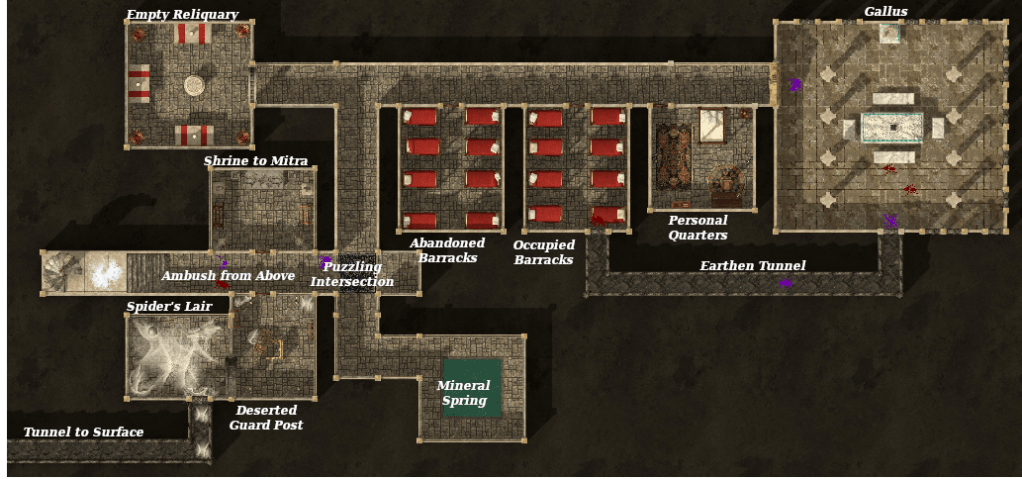 Venturing deeper into the undercroft, the party encounters Gallus leaving personal quarters. He is caught by surprise and quickly subdued by the party.